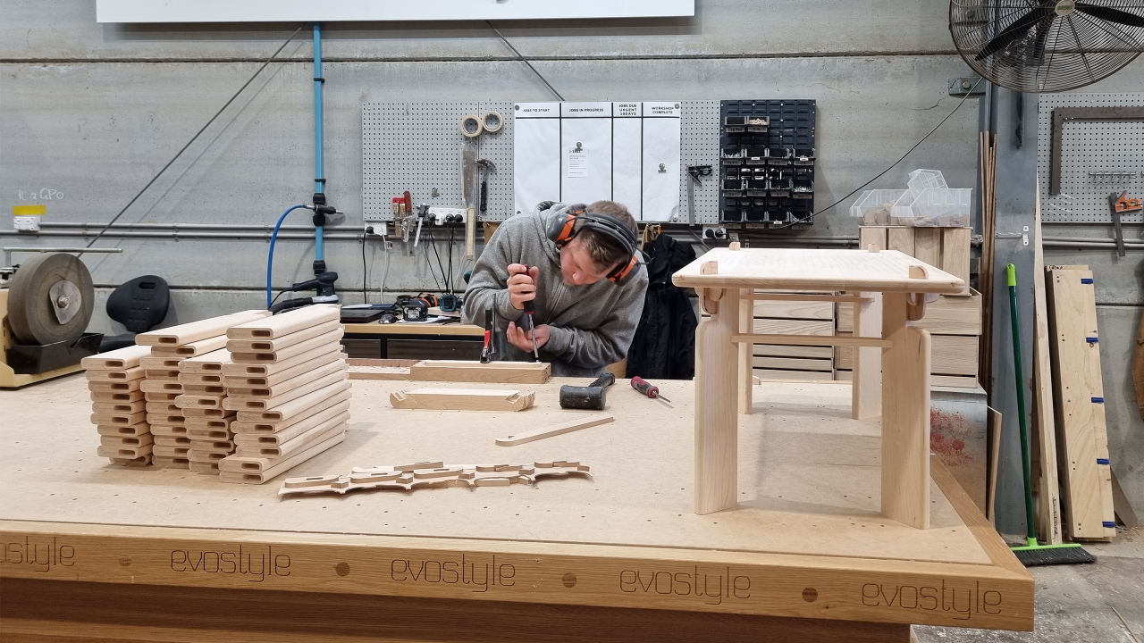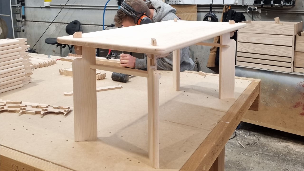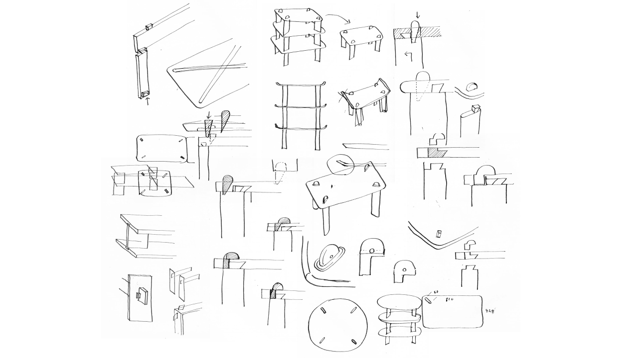 The piece is based around a joint, made of a handful of components that essentially wedge the leg and the table top together without the need for glue. Importantly too, the product plays with consumers’ expectations of flat-pack furniture. ‘Normally DIY furniture is made with plywood or MDF, while hardwood is for crafted pieces. But I wanted to give the user more chances to touch and feel the real wood and making is a good way to do that I think,’ says Shin. When a number of the tables are stacked on top of one another – the top peg locating on the underside of the leg – they form a shelving system.