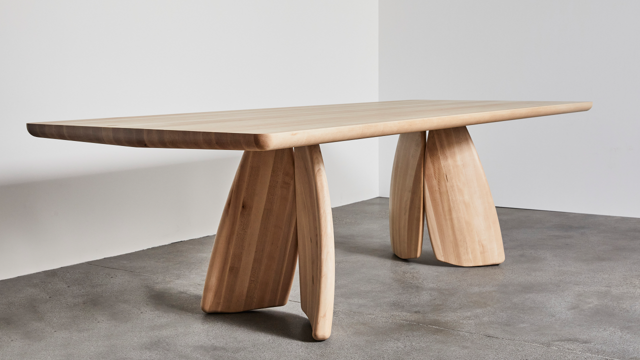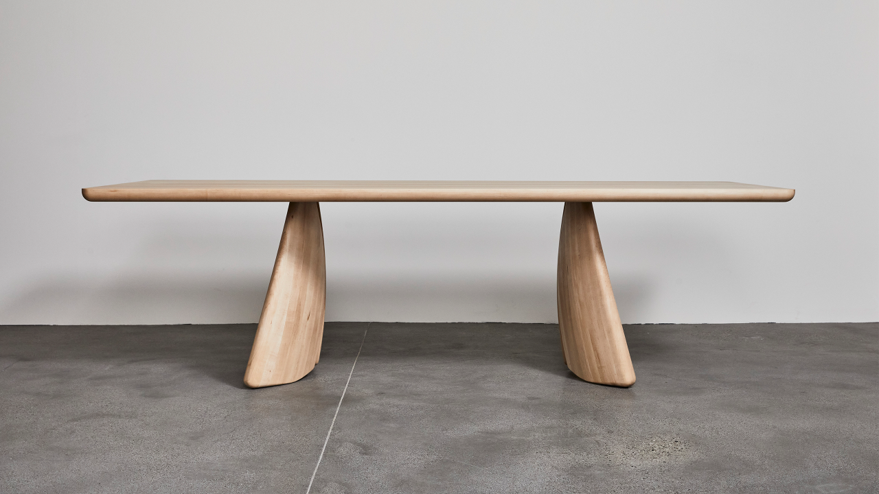 Alter Ego stems from the desire to give lightness and freedom to a usually static and imposing piece of furniture such as the table. To achieve this, the designer wanted to bring opposites into dialogue: the freedom of form of the curved lines that seem to seek infinity and the symmetry that develops from a central point around which everything rotates, continually changing its appearance without ever losing rigour. The result is a solid table in which everything contributes to giving life to shapes and materials, without any one element prevailing over another. The designer opted for American maple as its light colour with golden hues enhances the sculptural appearance of the design.