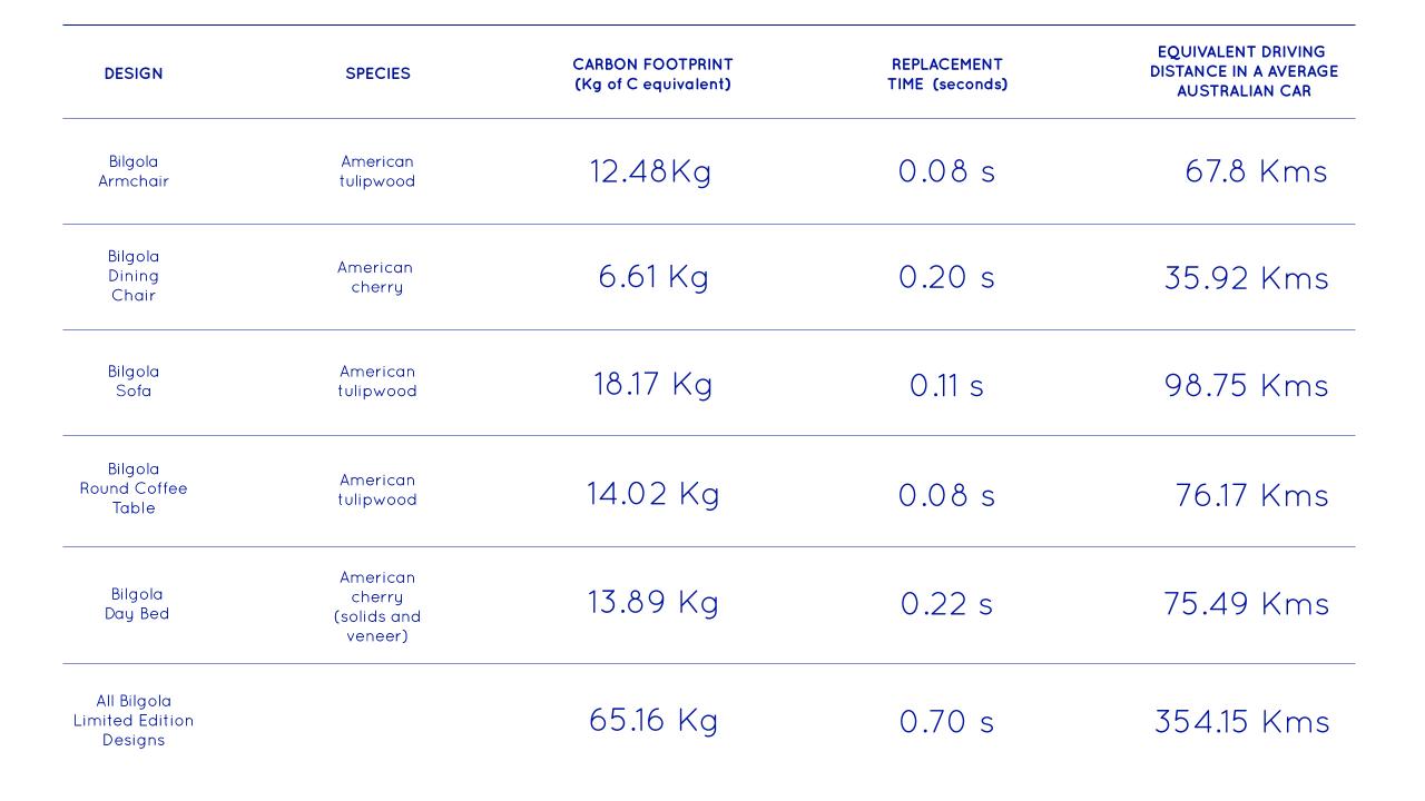 The carbon footprint total for all the designs is only 65 kg CO2 eq., about the same as driving 350 km – remarkable when it is considered how far the wood had to travel, due to the large amount of carbon stored in the finished designs, the offsets from incineration of waste wood, and low energy inputs throughout the life cycle. The environmental impact was helped by the thinner sizes of timber used in the project and that the hardwoods selected dry relatively quickly.