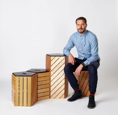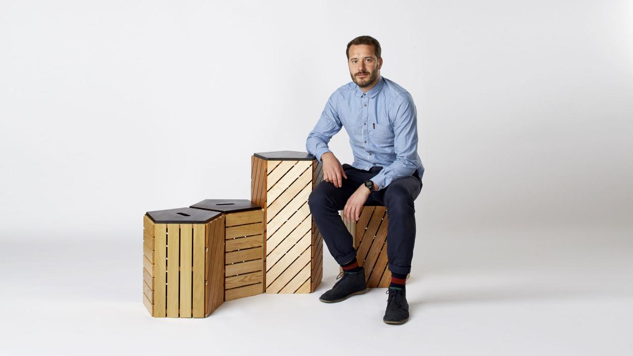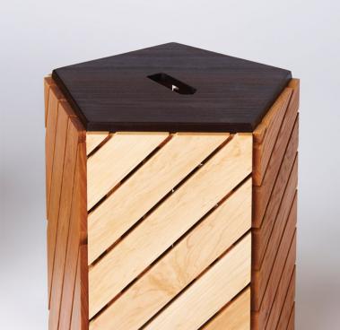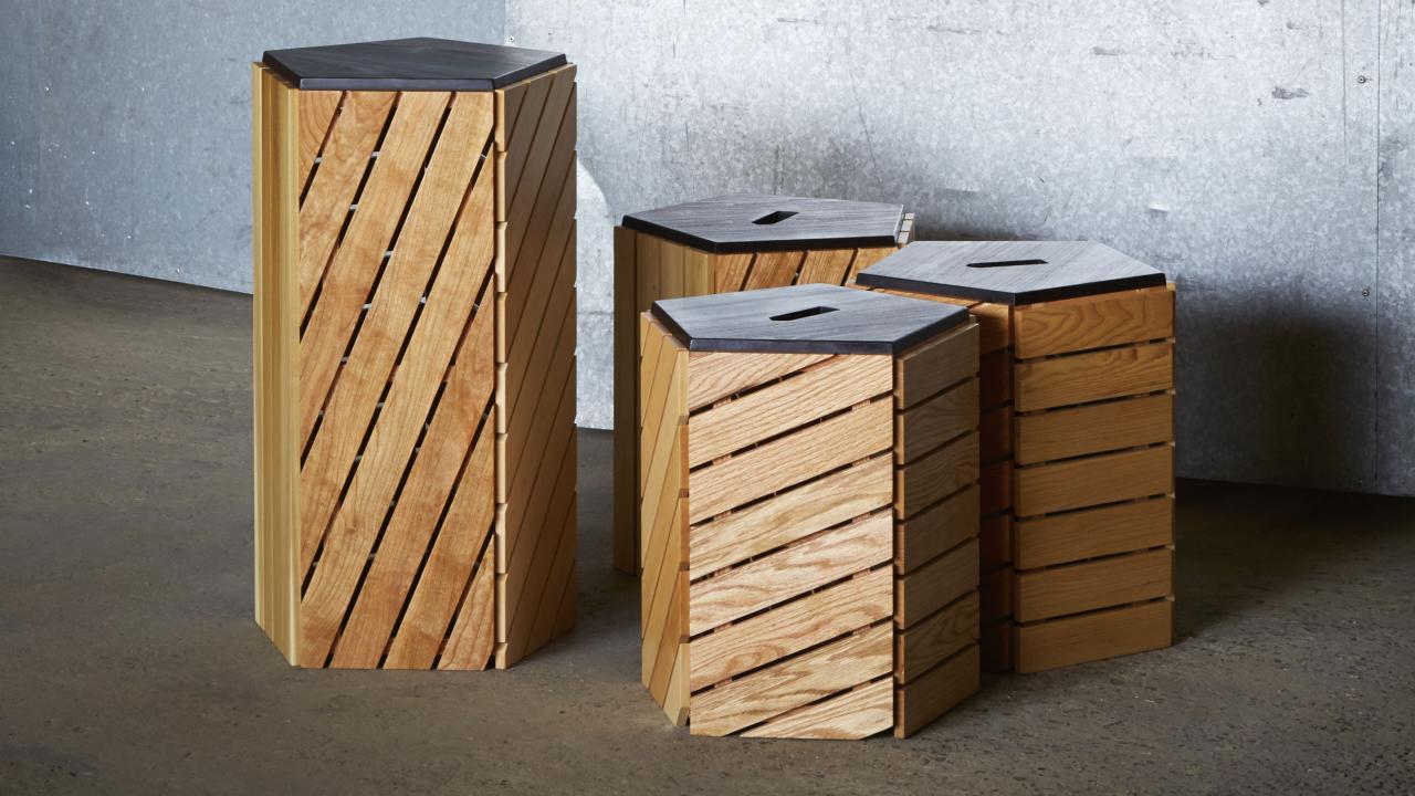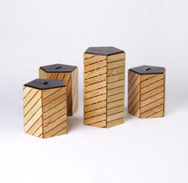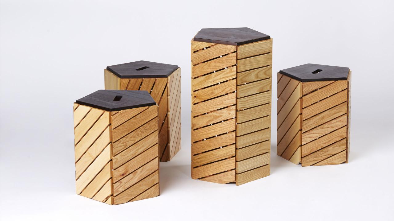 Designed by Ed Swan, Shift Series comprises stacking pentagonal seating, made in a geometric patchwork of five American hardwoods.
