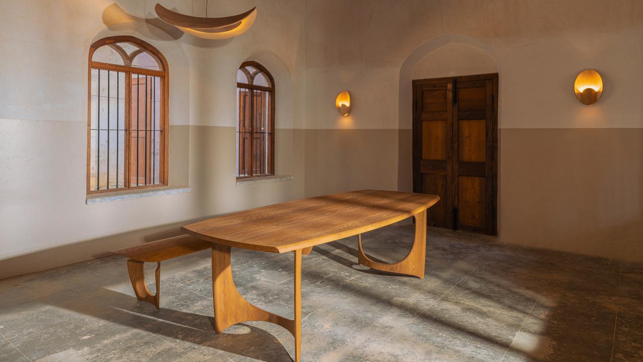The dining table, made from American red oak, is deceptively simple in structure, being two facing half cylinders, which have then been carved and shaped. The carving and shaping was done on-site, with a pencil, jigsaw and hand tools. According to Markowitz, two facing half cylinders is the simplest way to make a table with curves. However, you can barely read the initial cylinder shape at all in the final designs, as the handwork and sculpting has taken the form somewhere else (while retaining the structural logic of the half-cylinder).