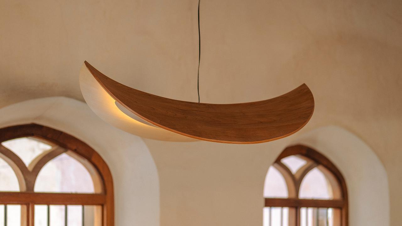 “American cherry has been used for both pendants on account of its rich, warm tone, which helps to create an approachable vernacular quality to these sculptural shapes. Being hard and stable when dry, the wood is very easy to stain and finish to an excellent surface. It is thus highly prized for furniture and interior joinery. On the inside, a single skin of maple veneer is used - this has been chosen because of its lovely lighter tone whose brightness will more readily reflect and cast light. These two timbers work really well together with a gentle complementary contrast,” - Adam Markowitz.