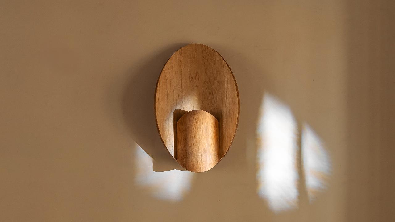 In addition to the pendants, the wall sconce takes the two petal shapes and intersects them face to face to create a surface, which reflects the light, and a smaller shroud, which conceals the light source. In this piece, Markowitz expresses the intersectional quality of the design logic by showing the petal components passing through each other. This also creates opportunities to conceal wall mounting and wiring. Phantom Hands produced two wall sconces, a hardwired version and a plug-in version. One sconce was made with a blend of cherry & maple to match the pendant lights, and one sconce entirely in maple to really celebrate the qualities of this timber species on its own.