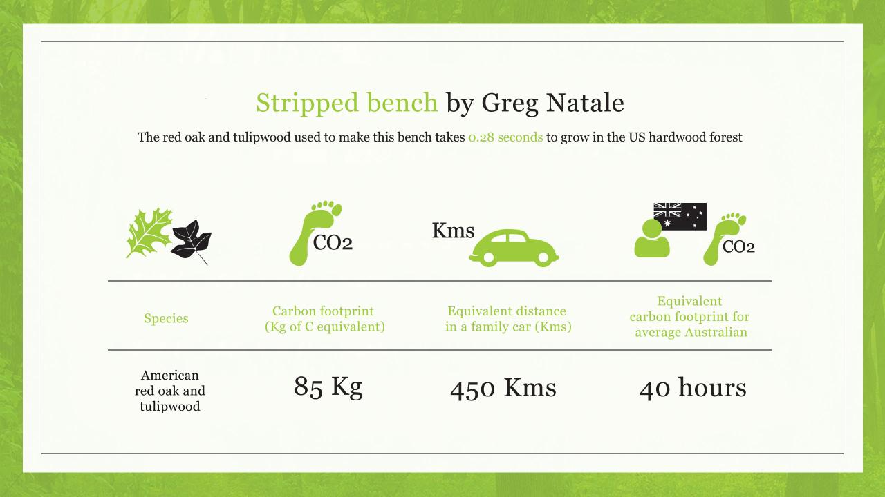 The carbon footprint of all the Seed to Seat designs is just 0.54 tonnes of C equivalent. That is about the same as the emissions produced by the average Australian in just 9 days.