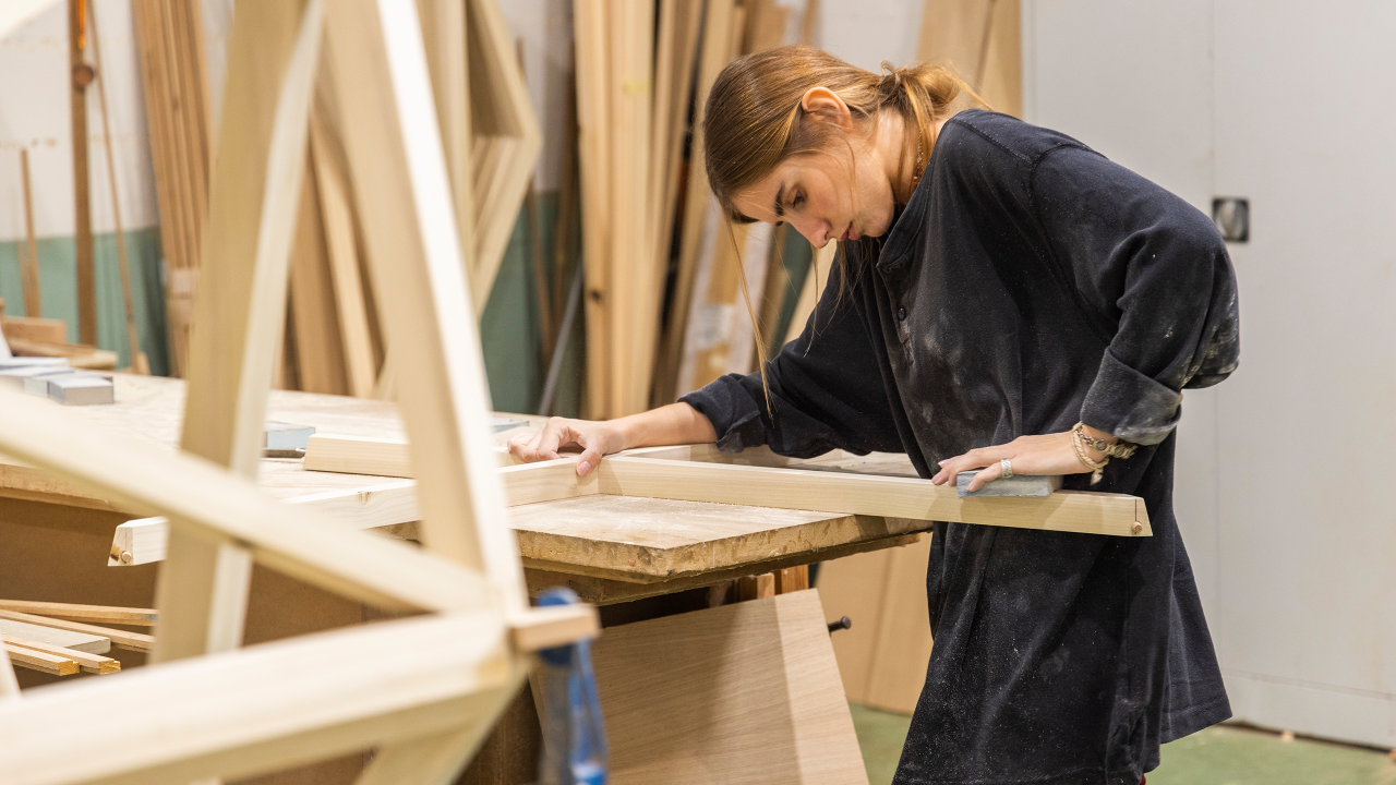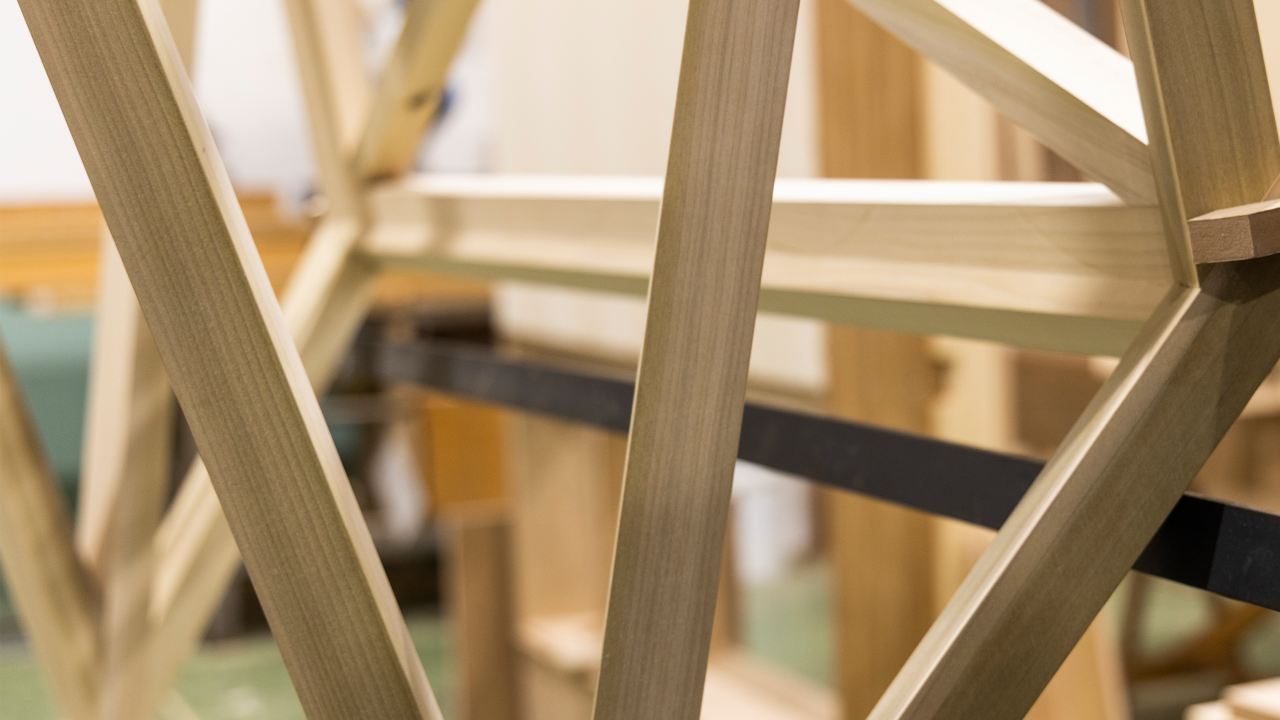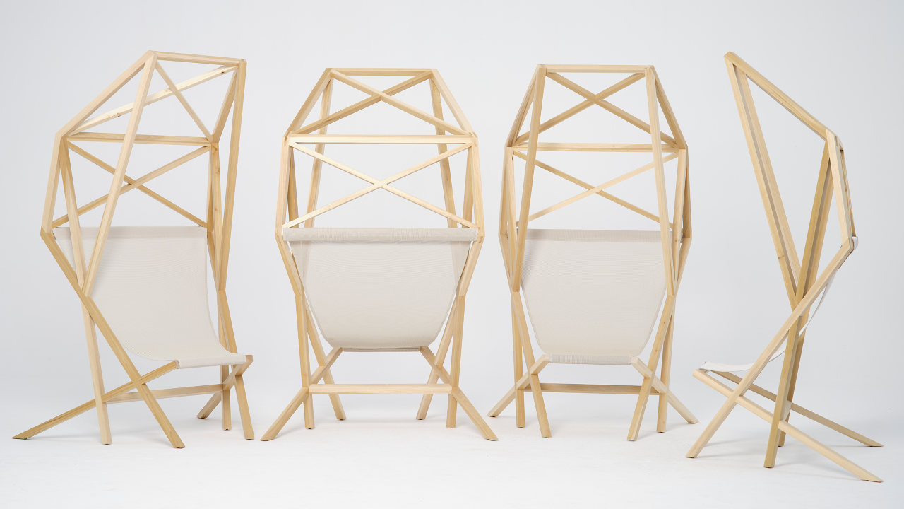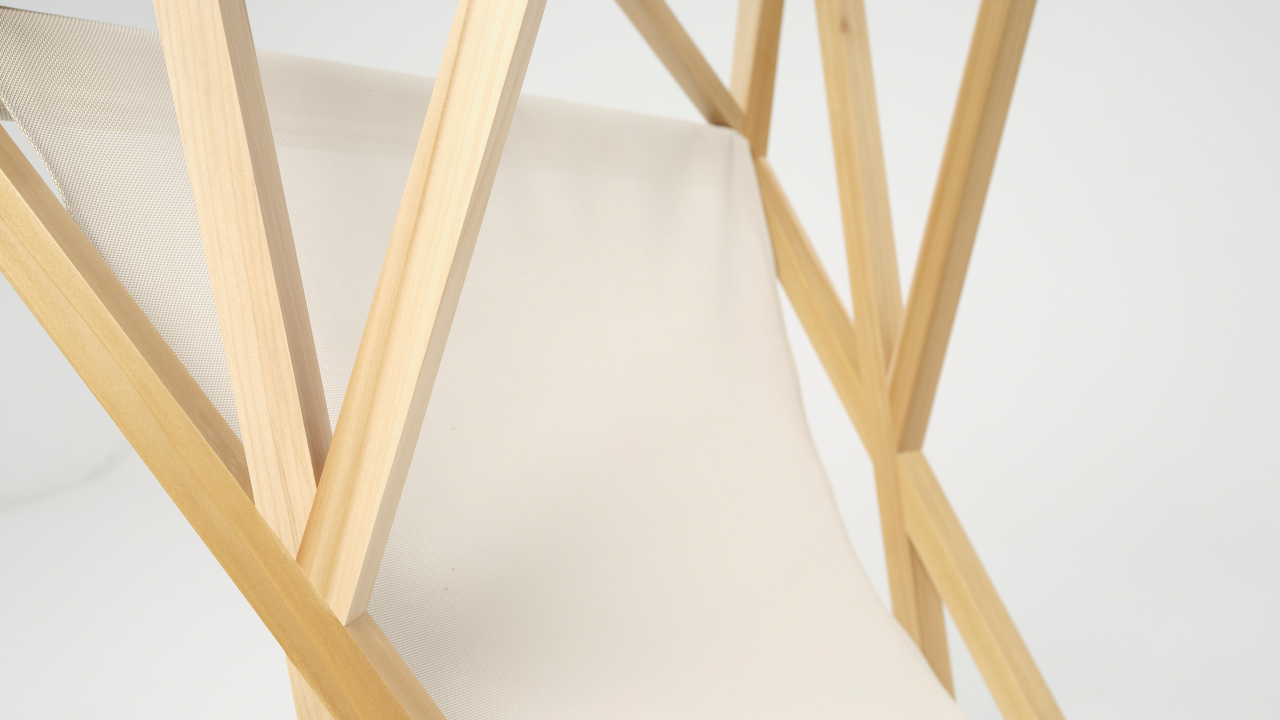 The designers of TÖEI wanted to create a space for rest and escapism, which led to them an architectural shape that forms a cocoon around whoever is sitting inside. Its structure is formed by slats of timber that are precisely dovetailed together at a 45 degree angle to give the chair strength and durability. American tulipwood was the timber of choice. Because of its overall strength properties relative to its weight, tulipwood lends itself well to the lightweight design of the chair. Varying tones between the heartwood and sapwood adds character to the piece.