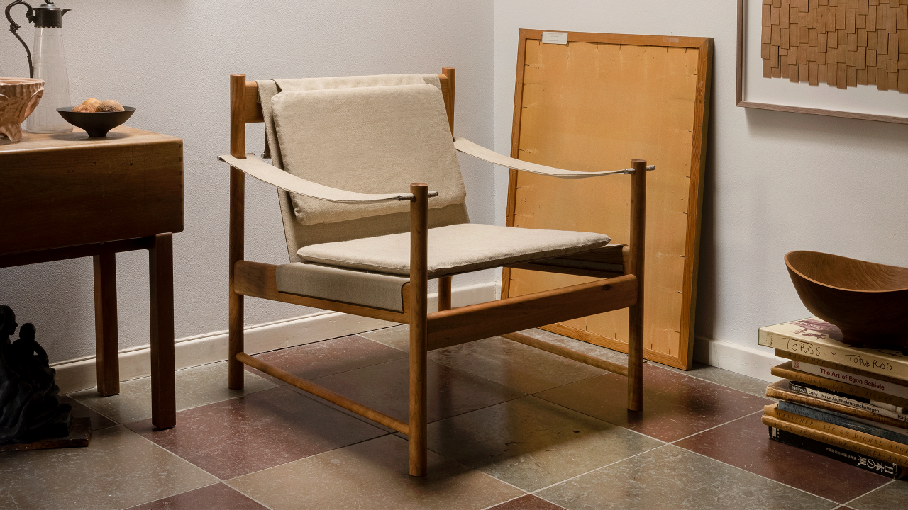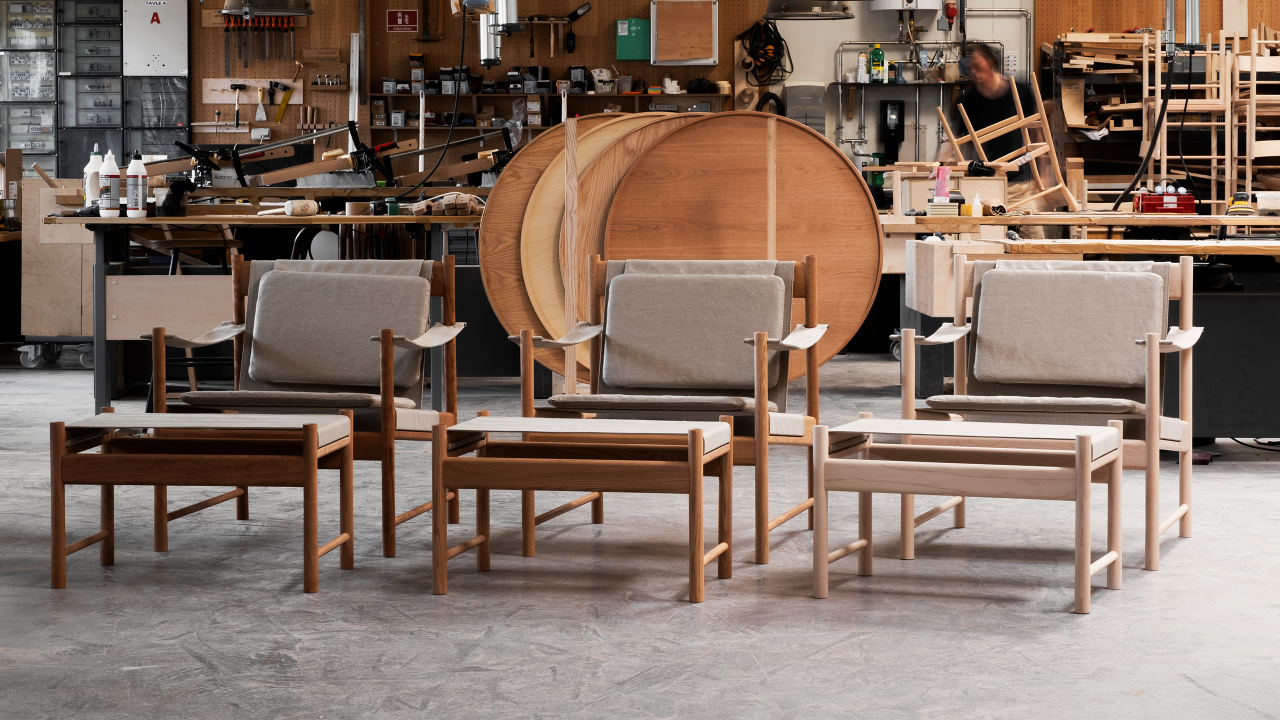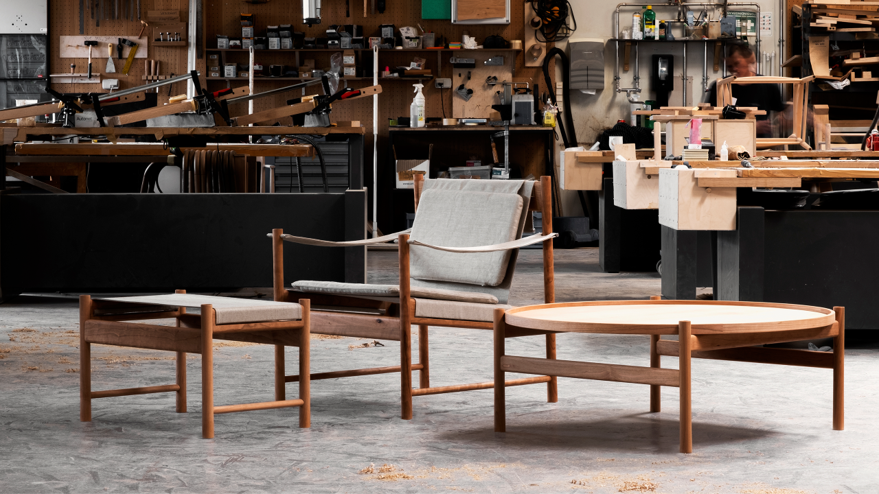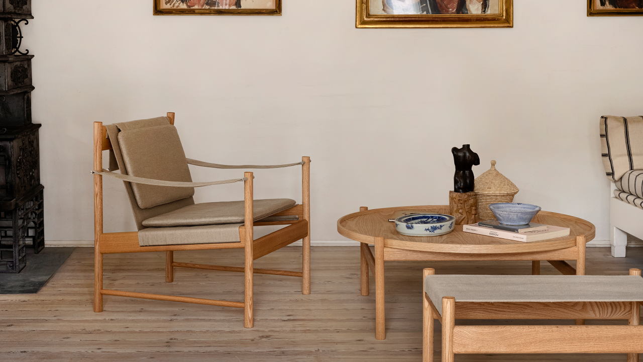 The Home of Hans Bølling features the lounge chair alongside two other new Bølling designs – a stool and a coffee table, both inspired by his classic Tray Table design from 1963, all made from U.S. red oak, maple and cherry.