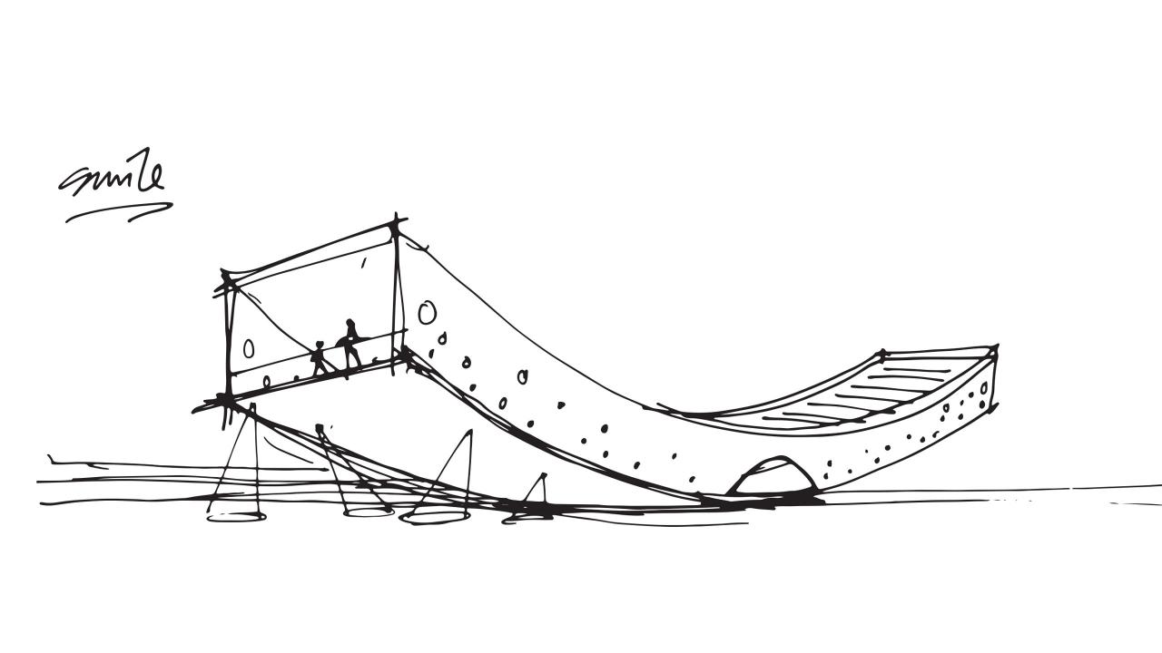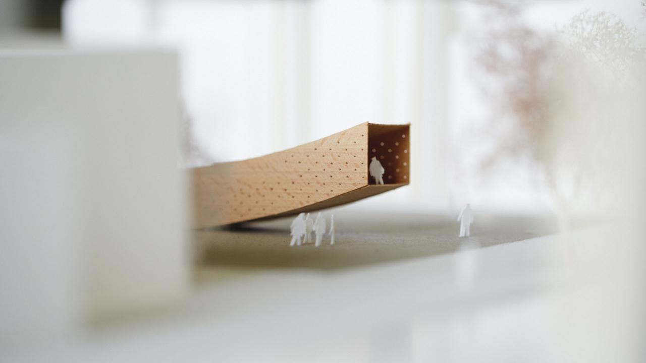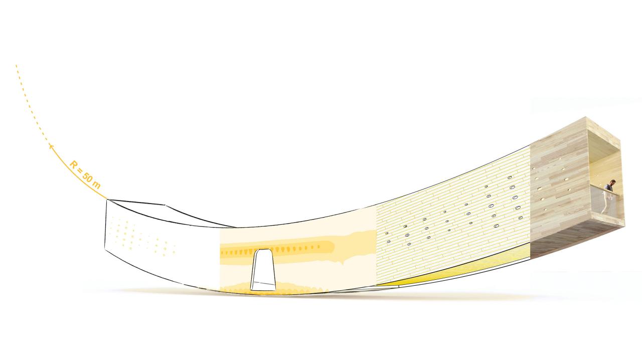 This project set out to test American tulipwood CLT and showcase it in a series of construction products. Exploiting the properties of tulipwood CLT, Architect Alison Brooks came up with the concept of a beam that curves up at both ends. The CLT tube is an inherently strong shape, in the same way that a steel tube is. The curve means that it cantilevers from, effectively, a single point in the centre.