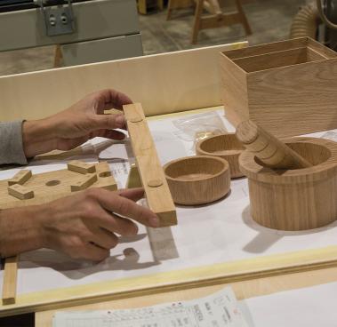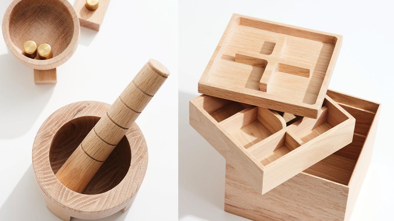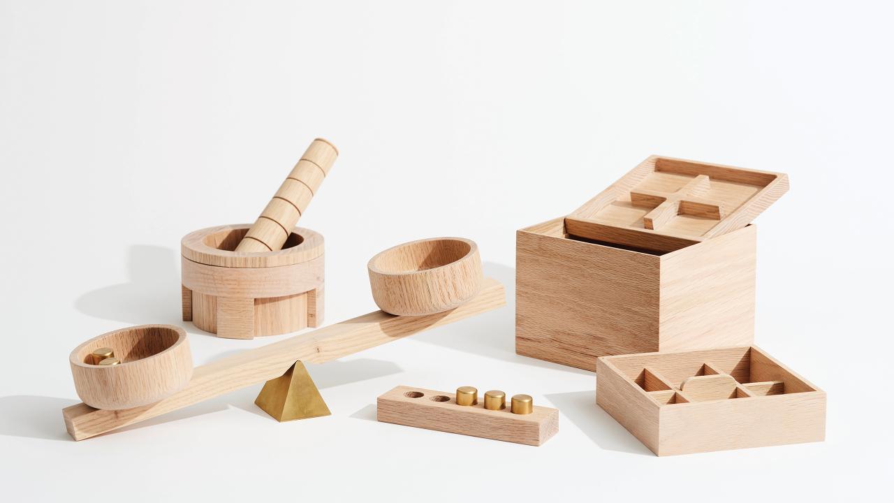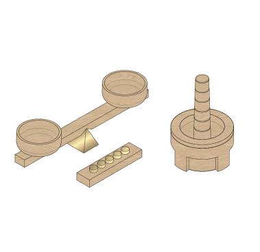 A collection of objects, including scales and a mortar, made for the preservation of manual coffee making.