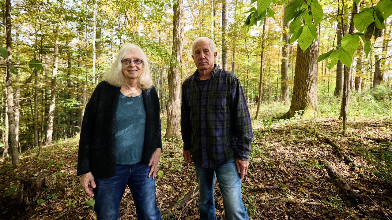 Image: Nancy Baker and forester Daniel Swift on Nancy’s plot of land. Photography by Petr Krejci.