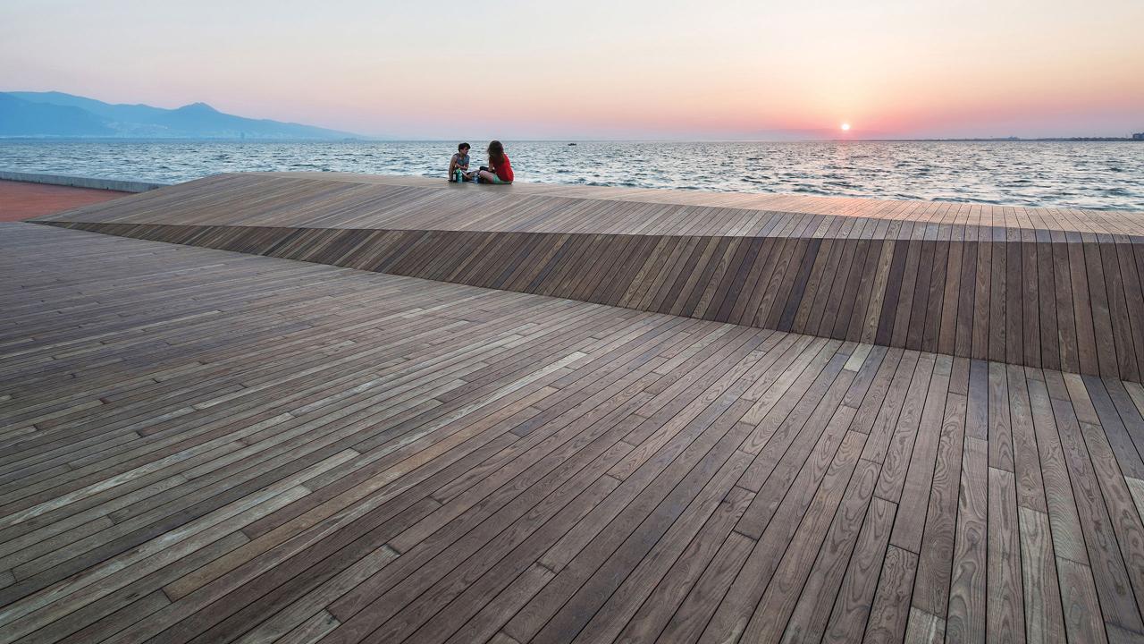 Al igual que ocurre con la pasarela, este amplio espacio ofrece una sensación acogedora que puede atribuirse principalmente a la textura natural del ash térmicamente modificado. Construido a partir de una serie de plataformas de madera que se reclinan sobre una ladera boscosa hasta llegar al agua, el diseño permite a los usuarios lograr una mayor conexión con el mar. De esta forma, el espacio recreativo ayuda a los usuarios a redescubrir un ritual de Esmirna olvidado desde hace tiempo pero aún presente en la memoria urbana, e invita a los habitantes de la ciudad a ver la puesta de sol y pasar un valioso tiempo juntos al atardecer.
