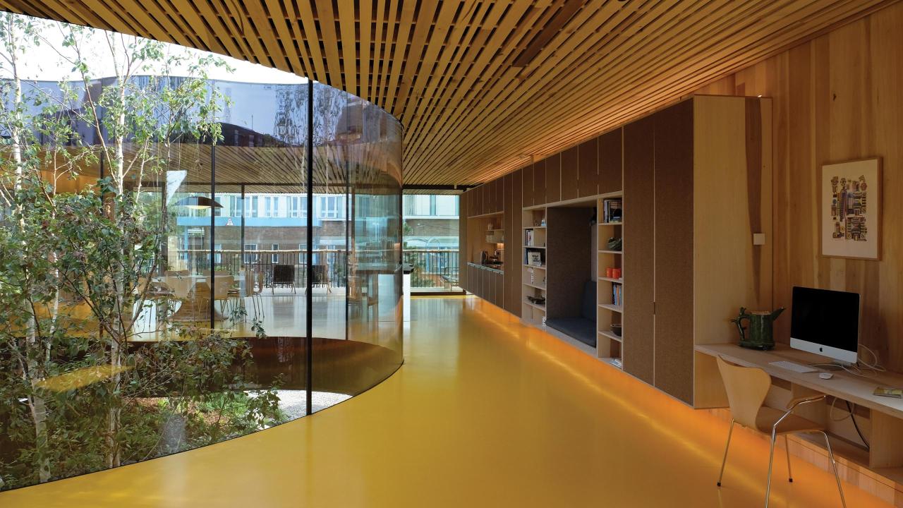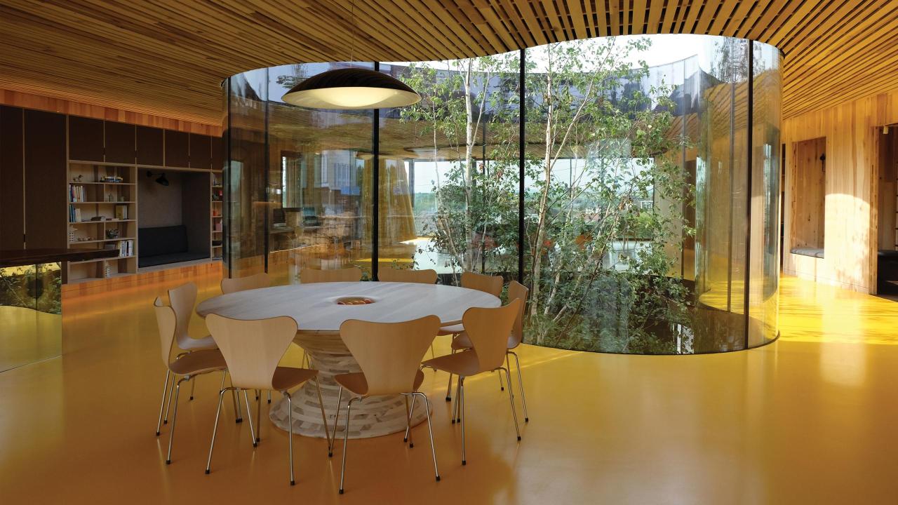 The centre of the building - 'the hole in the middle' - features a curved glass glazing with a tree reaching through the middle of it. The CLT wall panels gently follow the curvature of the glass creating a smooth flow guiding visitors around the building.