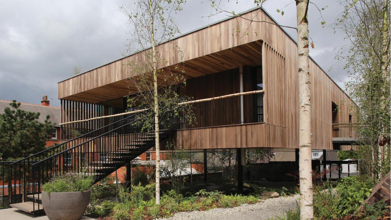 Outside, thermally modified American ash decking is covered by the roofs canopy, American tulipwood, to offer shelter for those with light sensitive skin from radiotherapy, without detracting from the tranquil views over the hospitals gardens.